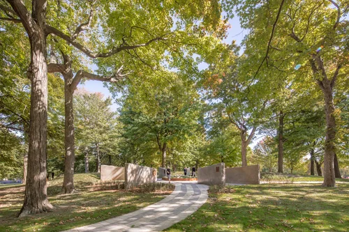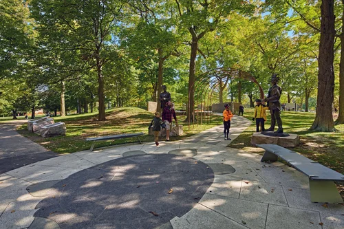 Landscape of Nations is a living memorial set in Queenston Heights Park beside Brock’s Monument, honouring the Haudenosaunee (Six Nations) Confederacy and other Indigenous allies who were pivotal in the War of 1812—and recognizing the 1815 peace and reconciliation council held in Niagara. Visitors enter between bronze statues of war captains John Norton (Teyoninhokarawen) and John Brant (Ahyouwae̱hs), then pass beneath a symbolic “longhouse” and along a walkway patterned after the Two-Row Wampum. At its heart is the Memory Circle: eight Queenston-quarry limestone walls radiate like a sunburst around a bed of sacred sweetgrass; medallions name the Six Nations and Native allies. An eastern white pine—the Tree of Peace—marks the memorial’s exit.